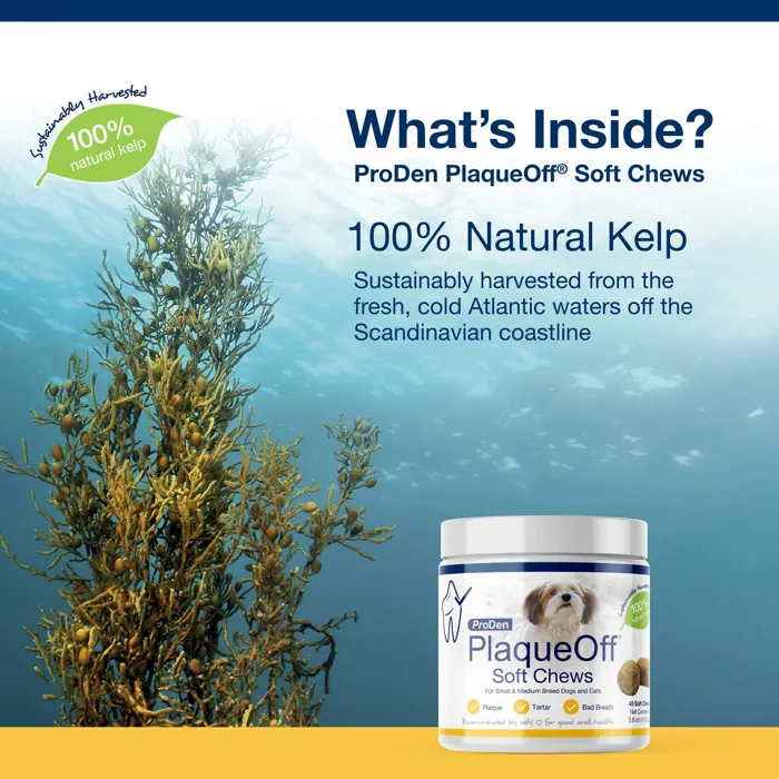 For use in small & medium breed dogs. Recommended to support healthy teeth, gums and breath odor. The ProDen PlaqueOff key ingredient is 100% natural kelp and is sustainably harvested in the clear, cold waters off the Scandinavian coastline. Clinical trials on our kelp have shown to help reduce plaque and tartar while helping to improve bad breath.
