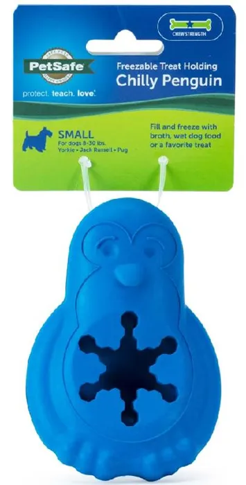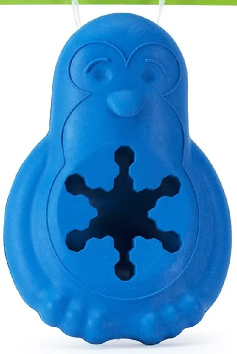 Give your dog a cool treat anytime with the PetSafe® Freezable Treat Holding Chilly Penguin toy. Fill the center of the Chilly Penguin with freezable treats like flavored water, chicken broth, yogurt or wet dog food. Place the Chilly Penguin in your freezer overnight and your pooch will have a delicious frozen delight to enjoy the next day. If your dog needs to reach the yummy treat faster, try trimming the snowflake points. Once the points are cut, there is no going back so we recommend trimming only a little at a time and then testing. The rounded base gives the Chilly Penguin a fun and challenging wobble. Stack multiple Chilly Penguins on top of one another to save on freezer space. Once your dog is satisfied, the Chilly Penguin toy can be easily cleaned by putting it in the top rack of your dishwasher.