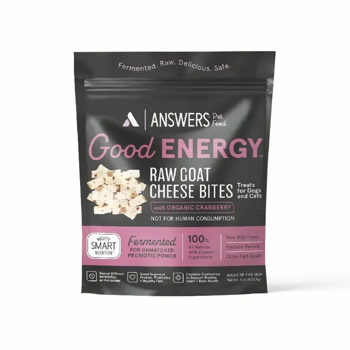 Indulge your pet in a guilt-free snack that tastes great and is great for them with Answers Raw Rewards Raw Goat Cheese Treats! Each treat is made with grass-fed organic raw goat cheese. These treats are packed with protein, organic superfoods, healthy fats, and beneficial bacteria to keep your pet happy and healthy. Features 1 billion probiotics per treat at only 19 calories per treat. Formulated for both dogs and cats. No GMOs or Artificial Additives. Made in USA.
